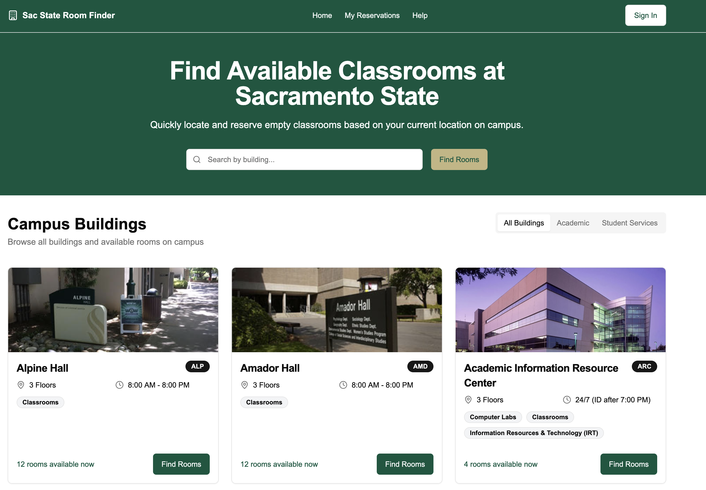 An empty classroom finder for students at Sac State to find quiet places to study on campus.